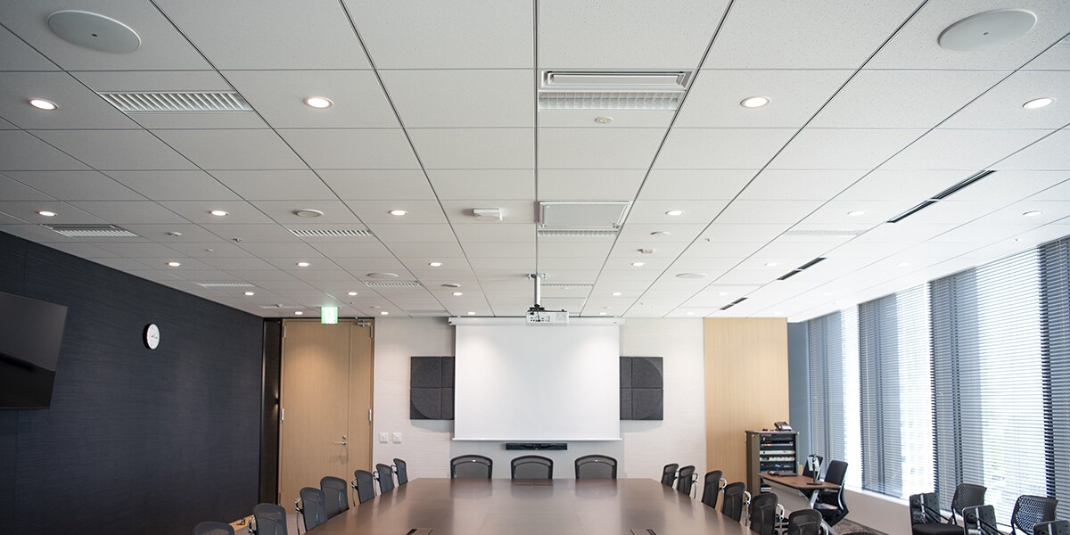 Sr. Takeyama: Inspecionei a sala de conferências antes da mudança e fiz algumas sugestões depois de ouvir algumas das razões que faziam com que estivessem insatisfeitos relativamente à sua situação atual e equipamento, e ouvi o que queriam fazer no futuro. No que diz respeito à acústica, eles queriam poder realizar conferências na Web sem problemas. Se possível, queriam manter tudo afastado do topo da mesa. Pensei que o RM-CG seria perfeito para este projeto porque está instalado no teto. Também inclui uma funcionalidade de rastreio “multi-beam” que rastreia automaticamente o orador. O tamanho da sala de conferências era apenas suficiente para duas unidades RM-CG cobrir. Depois de confirmar o equipamento real no escritório da Yamaha Music Japan, propus que adotassem o sistema ADECIA.
