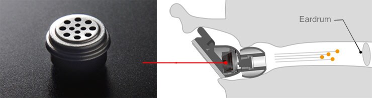 The ear buds are made of two types of silicon material—one hard and one soft. The sound passage section that uses hard silicon combines flexibility and strength through serration. It retains its shape even when inserted into the ears and fits perfectly to the shape of the ear canal. In addition to creating a comfortable fit, the ear bud also prevents deterioration of sound quality due to sound leakage.