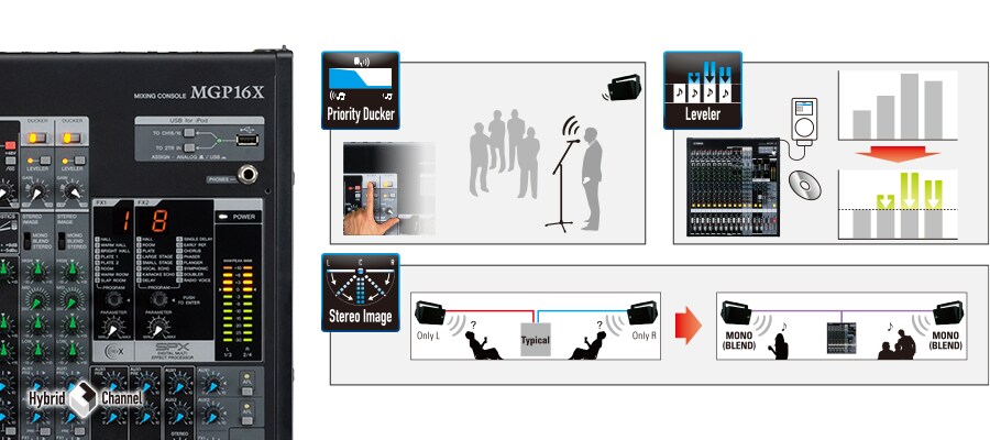 At the heart of the MGP's compact configuration, we've taken an innovative new approach to the utilization of digital technology in an analog mixer; adding high-resolution effects, iPod/iPhone integration and the superb functionality of our new Stereo Hybrid Channel to the warmth and musicality of premium analog sound. The MGP Series represents the ultimate balance of the converging technologies that are the heart and soul of Yamaha's extraordinary achievements in professional audio.