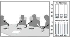 Quando ninguém está a falar o nível de entrada em todos os microfones é baixo e o ganho igual. Em vez de ser silenciado, o ganho é distribuído de forma equitativa por todos os microfones.