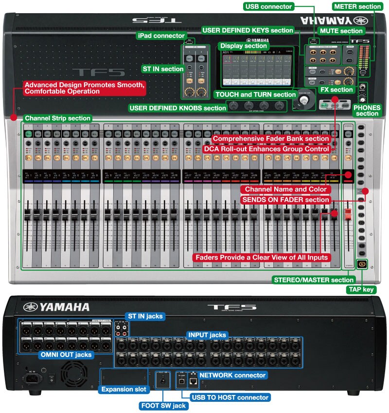 O hardware da série TF vem artilhado com uma série de funcionalidades que proporcionam uma operacionalidade e conveniência sem igual. Faders, controladores e botões vários, com um toque e ergonomia próprios, integram-se de forma harmoniosa com a tecnologia topo de gama de visualização, incluindo os displays de canais com cores e nomes evidenciados. O painel de toque oferece uma combinação perfeita entre resposta rápida e um compreensivo manancial de informação visual. O layout físico destes componentes é um complemento harmonioso a um sistema que oferece um fluxo de trabalho surpreendentemente eficiente.