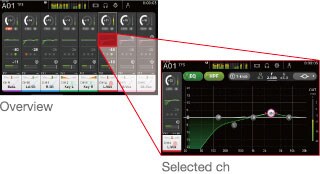 Tal como as mesas de mistura da série CL, a operacionalidade assenta nas janelas de “Overview” e “Selected Channel”. A apresentação de “Overview” mostra os parâmetros para oito canais de cada vez, enquanto o botão “Toca & Roda” oferece acesso direto ao ganho, controlador 1-knob EQ™, controlador 1-knob COMP™, limites de portas, níveis de envio de efeitos, pan e outros parâmetros. Toque no parâmetro selecionado uma segunda vez para mudar a visão de “Selected Channel” quando necessita de acesso a parâmetros mais detalhados, para um controlo mais preciso.