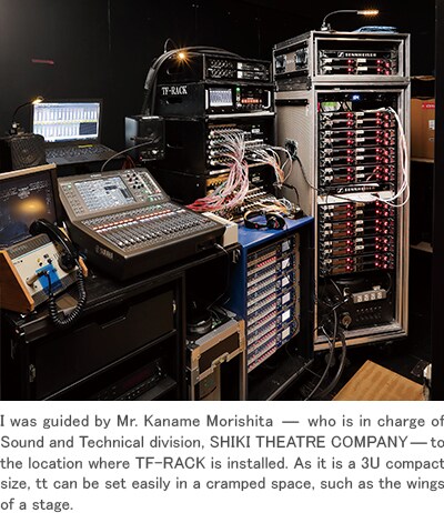 SHIKI THEATRE COMPANY’s “The Phantom of the Opera” is being performed at KAAT (Kanagawa Arts Theatre) for approximately 6 months from March 25 (Sat) to August 13 (Sun). TF-RACK is being used as an “operation system” at this venue, sending sounds on the stage of the current production to posts of recording and stage machinery, light control rooms below-stage basements, backstage and more. “The reason for this is for the person in charge of each section to seize the progress of the performance on a real time basis”, says Mr. Masakazu Kanamori, who is in charge of Sound and Technical division at SHIKI THEATRE COMPANY.