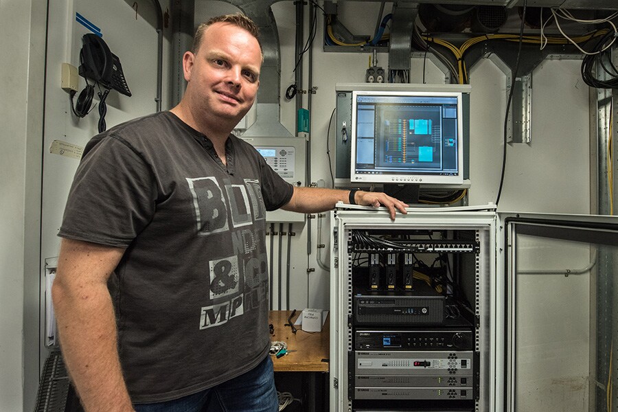 Mr. Ferdinand Boogaard in front of the central rack with the dedicated PC for programming MRX7-D