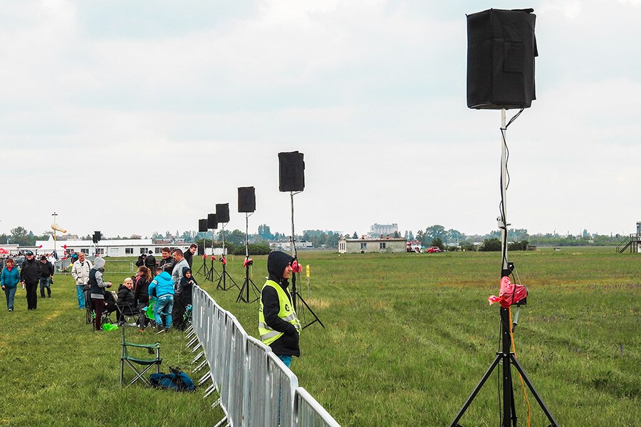 "Teníamos que tener en cuenta que puede haber hasta 100.000 espectadores en la zona principal y que todos tenían que escuchar y comprender los anuncios, incluso cuando pasaban aviones y con mal tiempo, como el viento y la lluvia. Los altavoces sólo podían colocarse a lo largo del límite de la zona de espectadores".