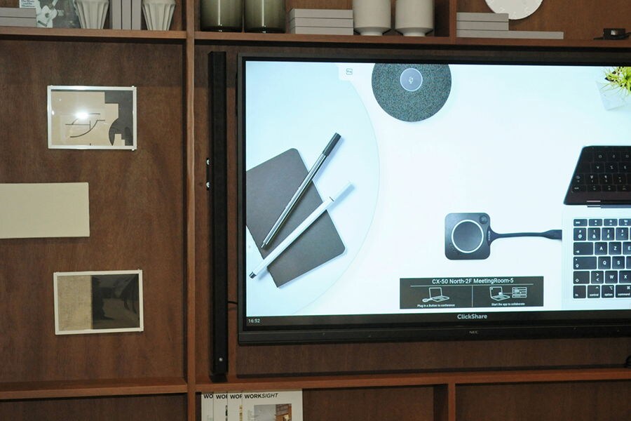 Sr. Nagai: Sim, penso que o efeito é significativo. Uma vez que o objetivo de uma reunião é assistir a expressões faciais e ler os momentos entre observações explícitas a fim de conseguir uma comunicação mais profunda, um ambiente como esta sala de reuniões, onde a mesa está livre de desordem e não é necessário estar constantemente atento à posição e distância do microfone, é simplesmente ideal. Gosto das excelentes qualidades de design do microfone de teto. Não só é instalado fora do campo de visão no teto - como também se mistura no teto de forma discreta.