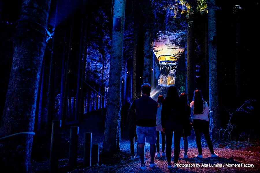 Alta Lumina is Moment Factory’s 12th Lumina Night Walk and the first in Europe. Visitors are invited to walk along a one kilometre path, where sound and light installations play out the story of a travelling music-maker and his hot air balloon. The nature of the Lumina Night Walks allows for physical distancing between visitors, so the creative team was able to create a high quality audio/visual installation with little compromise.