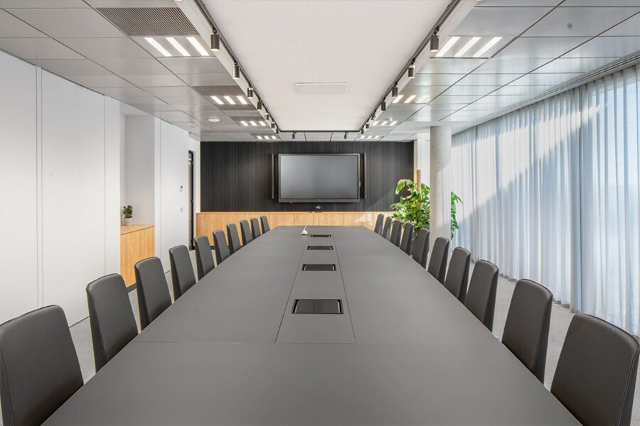 From the outset, OneVite selected the ADECIA conference ceiling solution, a pioneering and exclusive solution from Yamaha which integrates an RM-CG ceiling microphone, a pair of VXL-16P line-array loudspeakers located next to a large 82" monitor, and a signal and conference management processor RM-CR, being an all-in-one solution.