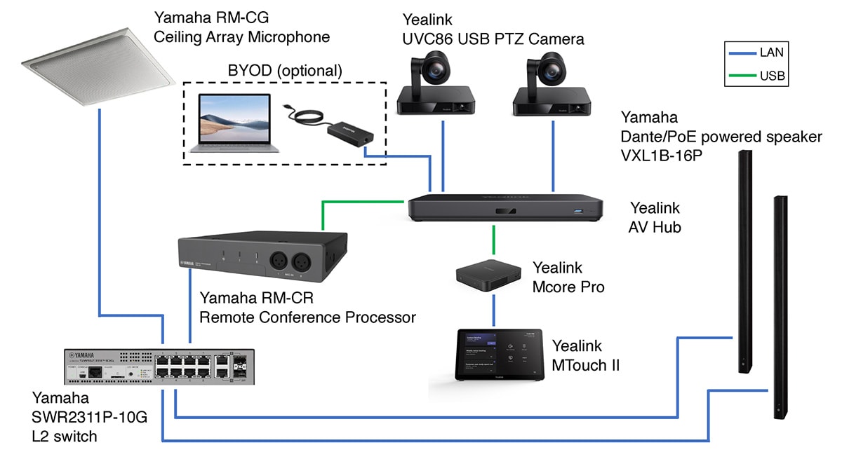 Complementing Yamaha’s advanced audio conferencing technology, Yealink’s expertise lies in its innovative camera solutions, which offer exceptional clarity and flexibility. At Yealink’s Customer Experience Center in Dallas, a Yamaha ADECIA Ceiling Solution is partnered with the Yealink UVC86 4K dual-eye intelligent tracking camera and Yealink AVHub to demonstrate the combined technologies.