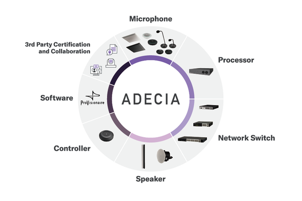 ADECIA is a comprehensive conferencing solution that covers audio from input to output and device management tools, as well as seamless integration of 3rd-party devices and systems.