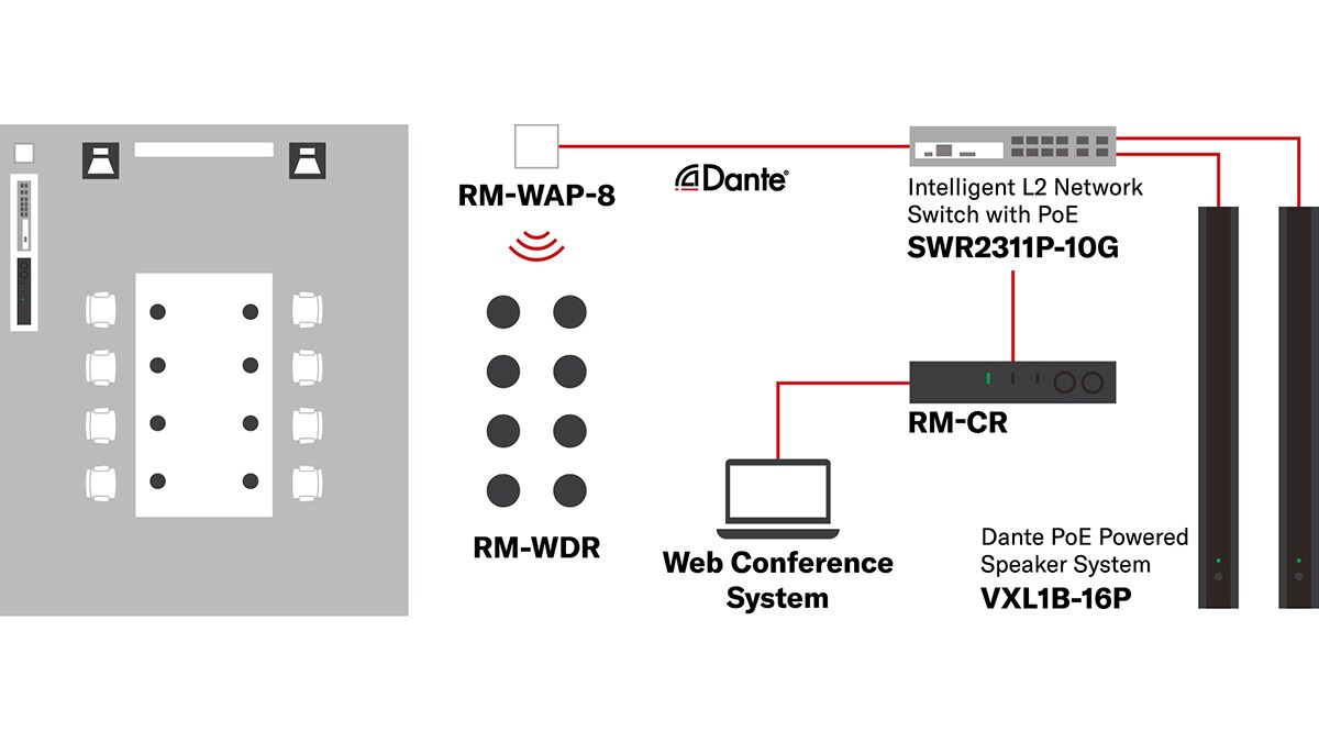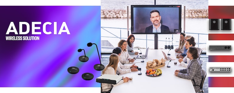 A Solução Sem Fios ADECIA ajuda as organizações a ultrapassar os desafios com a implementação, configuração e acústica da sala, fornecendo todos os componentes necessários para uma instalação bem-sucedida. O sistema de microfone sem fios (RM-W), o processador central (RM-CR), o switch de rede otimizado Dante (SWR2311P-10G) e as colunas “line array” POE+ (VXL1-16P) fornecem uma solução completa concebida para trabalhar em conjunto sem complicações.