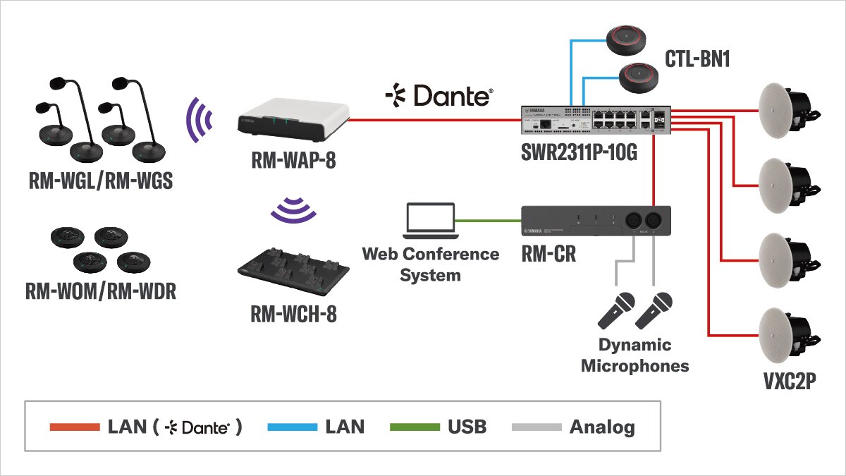 Os sinais de áudio/controlo podem ser transmitidos com um cabo de rede usando o protocolo de áudio por rede, "Dante". Isto resolve problemas de cablagem e de instalação. Além disso, num ambiente em que a disposição da sala de conferências e o número de participantes podem alterar, o microfone sem fios liberta os intervenientes de estarem cingidos a uma posição por causa da cablagem pré-instalada. É possível garantir uma maior flexibilidade através da capacidade de poderem utilizados até 16 microfones simultaneamente num único sistema sem fios.