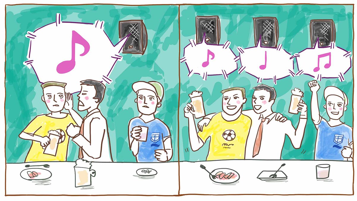 Quantas colunas são necessárias para a reprodução de música num espaço comercial?