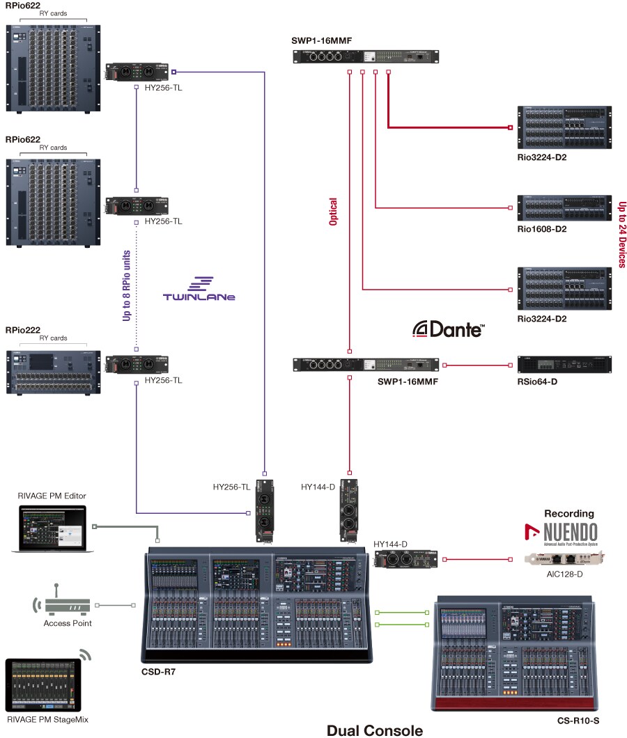 In a RIVAGE PM7 system the CSD-R7 can be fitted with a TWINLANe or Dante-capable HY card for use with RPio622/RPio222 or Rio3224-D2/Rio1608-D2 I/O racks, respectively. Up to eight RPio622/RPio222 units can be connected to the TWINLANe card, or up to 24 Dante devices, including Rio3224-D2/Rio1608-D2 units, can be connected via a Dante network. TWINLANe and Dante networks can coexist in a RIVAGE PM7 system. All components feature dual built-in power supply modules for failsafe redundancy.