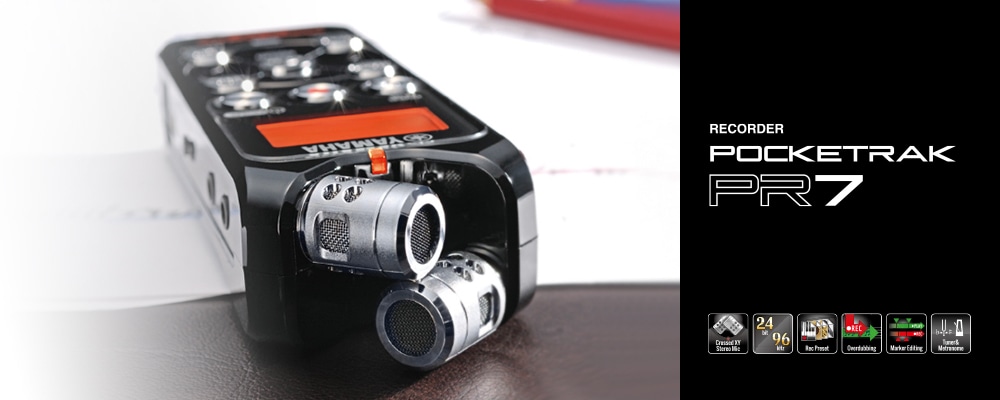O POCKETRAK PR7 é o novo gravador linear PCM da Yamaha que permite gravações de alta qualidade sem esforço, quando e onde necessite. Equipado com o recentemente desenvolvido microfone estéreo de cruzamento XY, o PR7 capta gravações stereo em alta resolução, conseguindo qualidade consistente e um som natural. Uma ferramenta indispensável para qualquer músico, o PR7 oferece funções essenciais de práctica, tais como um afinador e um metrónomo integrados, e também funções poderosas de gravação como overdubbing e editor de marcações – tudo facilmente acessível através de um simples e intuitivo interface. Inclui ainda cinco presets optimizados para se ajustarem a uma variedade de aplicações, para que num ensaio, em composição, a assistir a uma conferência ou a gravar no exterior, conseguir um som com qualidade de estúdio nunca tenha sido tão fácil.