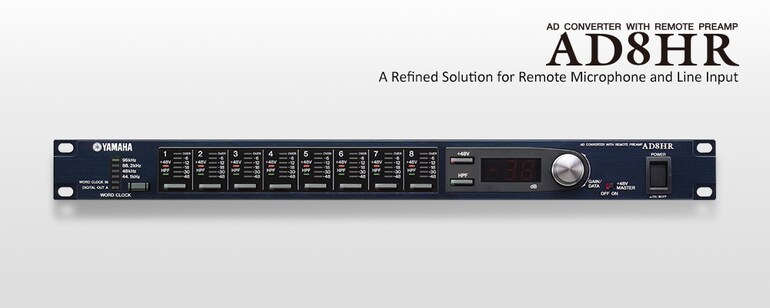 With the AD8HR Yamaha introduces a new generation of 8-channel remote microphone preamp/AD converters combining unparalleled sound quality with a host of innovative functions in a compact 1U rack size unit. The AD8HR can be used with Yamaha digital consoles such as the PM5D, DM2000 and DM1000, providing high-quality remote microphone preamps with analog circuitry derived from the extraordinary PM5000 analog console. The AD8HRprovides digital audio output via high-performance 24-bit/96-kHz AD converters, and simple digital connection allows gain, filter, and phantom power control right from the console!