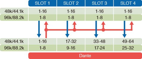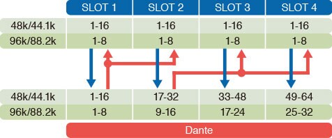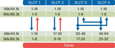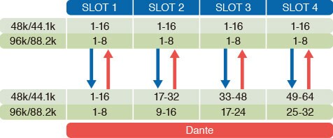 PADRÃO 7: Canais 1~32* Dante e Entradas 1 e 2 de um-para-um / Entradas 3 e 4 em simultâneo