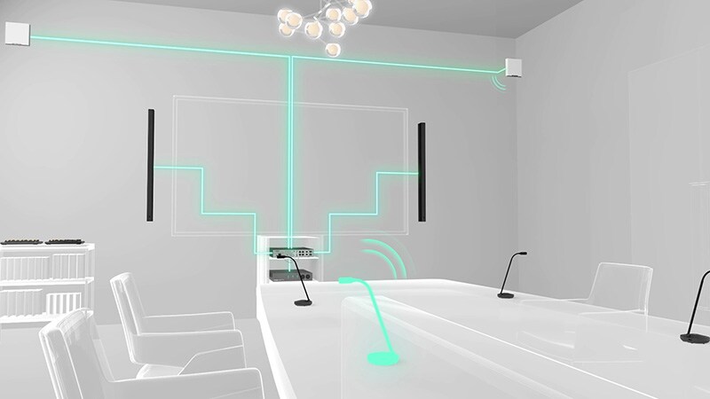A solução completa de conferências e reuniões que introduz o microfone de tecto e o processador de conferência remota, e inclui comutadores de rede PoE de reconhecida confiança e colunas amplificadas PoE com Dante PoE.