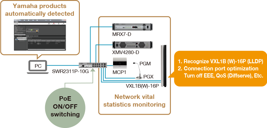 The "SWR2311P-10G" is an intelligent L2 switch that provides the ideal functionality for the "Dante" digital audio network that was developed by the Audinate Corporation and is now used world-wide, allowing construction of a stable network that simplifies settings, monitoring, management, and operation. When you connect the VXL1-16P to the SWR2311P-10G, optimal settings for Dante are made automatically via LLDP that is a protocol for passing system management data between a device and its neighboring device. PoE compliant ports can supply a maximum of 30W for all ports simultaneously. It can power not only PoE compliant devices such as the "MCP1" wall-mount controller used for controlling the volume of sound equipment used in conference rooms, or wireless access points, and can also provide ample power for driving even devices that require higher-output PoE such as the VXL1B-16P or VXL1W-16P.