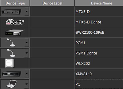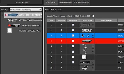 Identifying devices connected to a switch by only their IP or MAC address is a difficult and error-prone approach. Connected Dante devices are identified by a Dante icon as well as a device ID previously set up via the Dante Controller software. You can also enter additional info, such as the location of the device, in the Label and Comment fields.