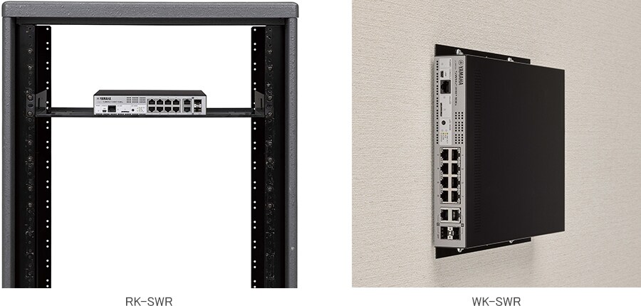 The separately sold "RK-SWR" rack mount accessory can be used to install the unit in a 19-inch rack, and you can use the "WK-SWR" wall mount accessory to mount the unit on the wall (Do not install with the LAN ports facing upward or downward) or ceiling with a height of 2m or less, further expanding your choice of installation locations.