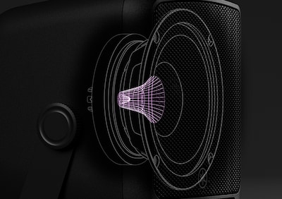 Sistema de PA portátil equipado com um amplificador de potência de 100 W, driver coaxial de compressão com bobina de voz HF de 1,4" e cone LF de 6,5", um misturador de 3 canais, bateria interna de iões de lítio, funcionalidade de E/S via USB ou Bluetooth®, e compatibilidade com USB Power Delivery (USB PD)