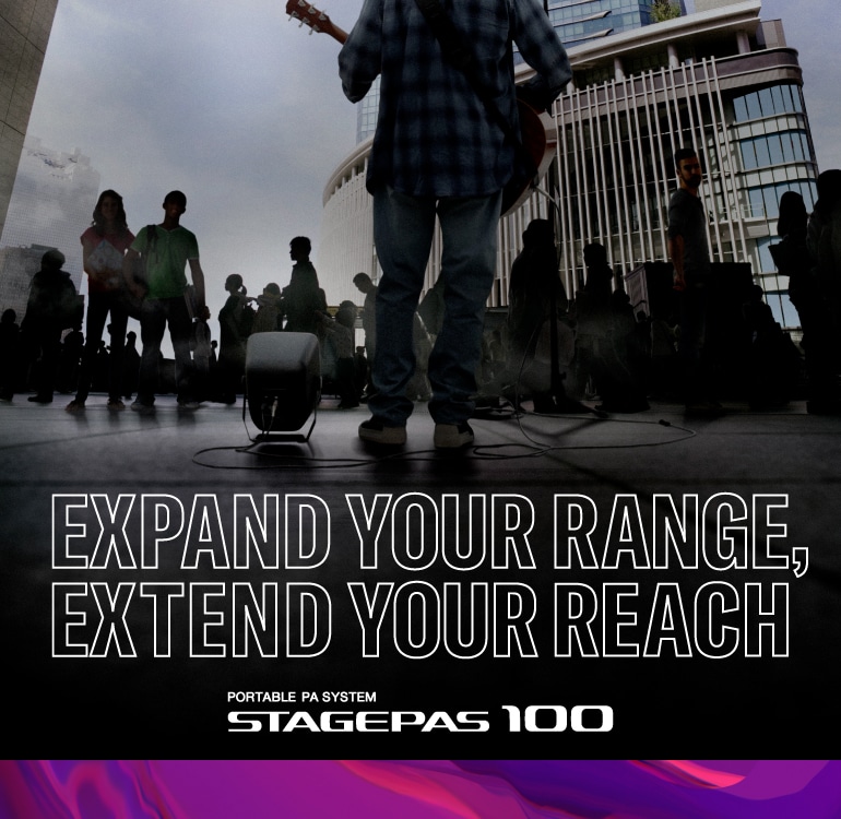 O sistema de PA portátil STAGEPAS 100 alcança um equilíbrio perfeito entre som de alta qualidade e máxima portabilidade, permitindo transformar praticamente qualquer local no seu próprio palco intimista. Disponível em duas versões, uma com bateria e outra sem, o design leve, mas durável, a operação sem esforço e o som surpreendente do STAGEPAS 100 ajudarão a fazer chegar ao público toda a expressividade da sua atuação.
