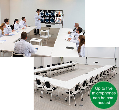 - Excellent scalable and flexible solution for large meeting rooms with special table configurations, connecting daisy chain up to 5 microphones and support 2 external speakers