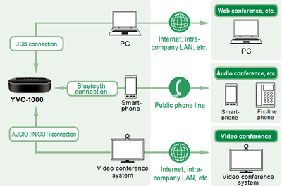 Connect to the YVC-1000MS via USB, Bluetooth*1, or the audio terminals*2 of a conferencing system for high quality audio in your conferences and meetings. This range of connection options allows you to quickly adapt to a variety of communications environments, as well as situations where conferencing might otherwise be difficult due to the lack of a landline, or internet connectivity issues.