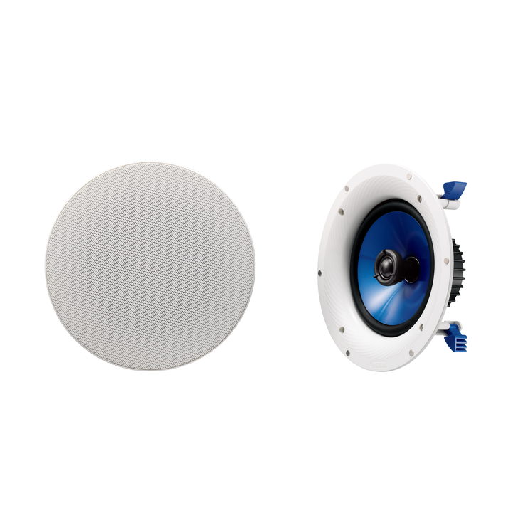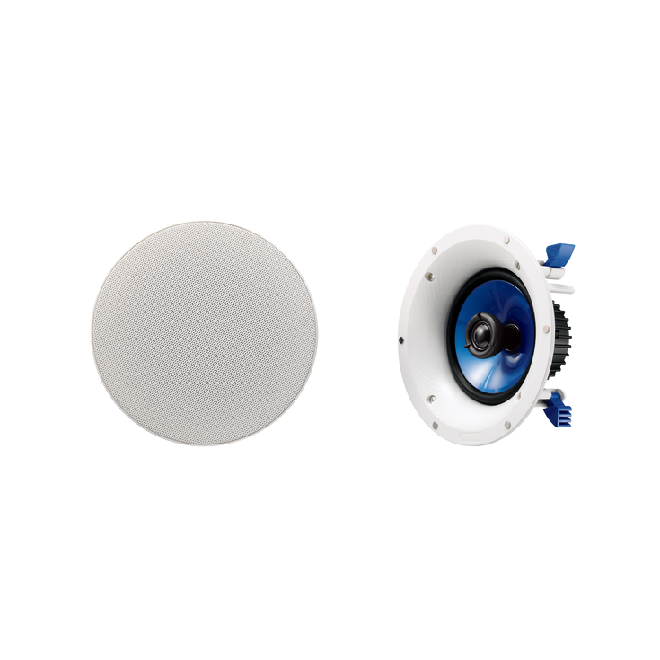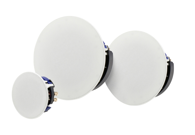 An 8" coaxial ceiling speaker with cone woofer, fluid-cooled soft-dome swivel tweeter, 140W power handling, horn-shaped acoustic baffle and thin, light grille with magnets