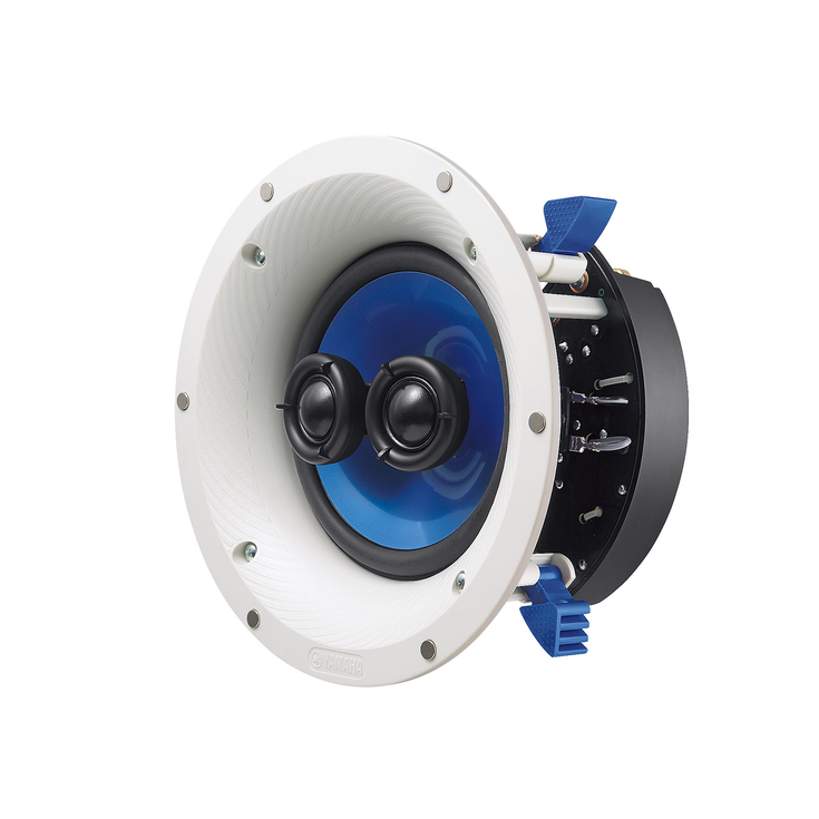A 6-1/2" coaxial ceiling speaker with double voice coil cone woofer, two fluid-cooled soft-dome swivel tweeters, 120W power handling, horn-shaped acoustic baffle and thin, light grille