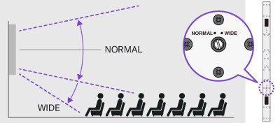 A cobertura vertical pode ser ajustada através de um switch no painel traseiro. Ajustar o switch para "Wide" expande o ângulo de dispersão somente na direção descendente, melhorando a cobertura na parte frontal da área de audição em situações onde as colunas estão instaladas numa localização alta.
