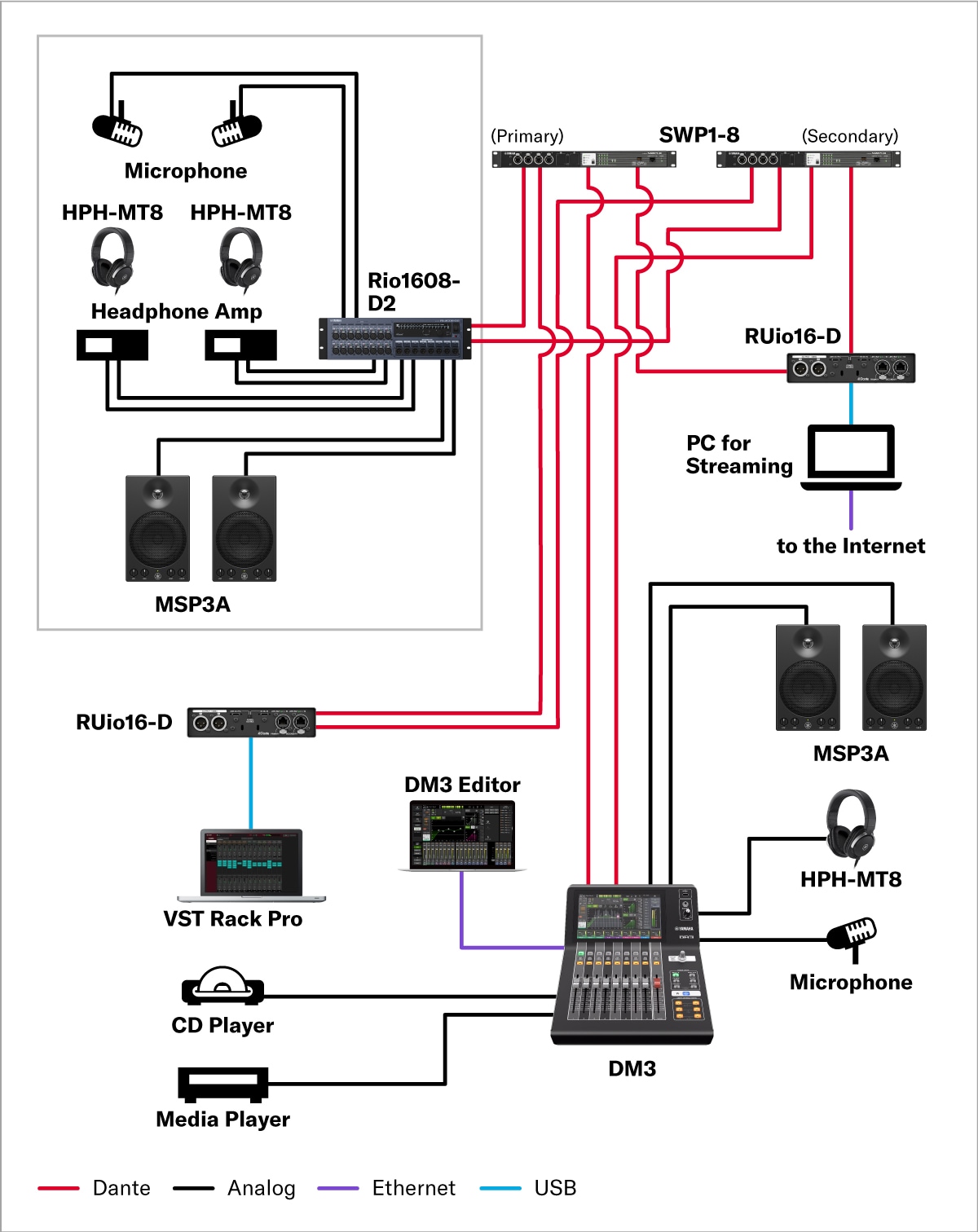Este é um estúdio utilizado principalmente para gravação e transmissão de programas de debate, como um estúdio de rádio. A mesa de mistura digital compacta DM3 está equipada com uma grande quantidade de entradas e saídas. Pode criar um sistema flexível e escalável centrado na DM3, ligando-a ao equipamento envolvente através da rede de áudio Dante.