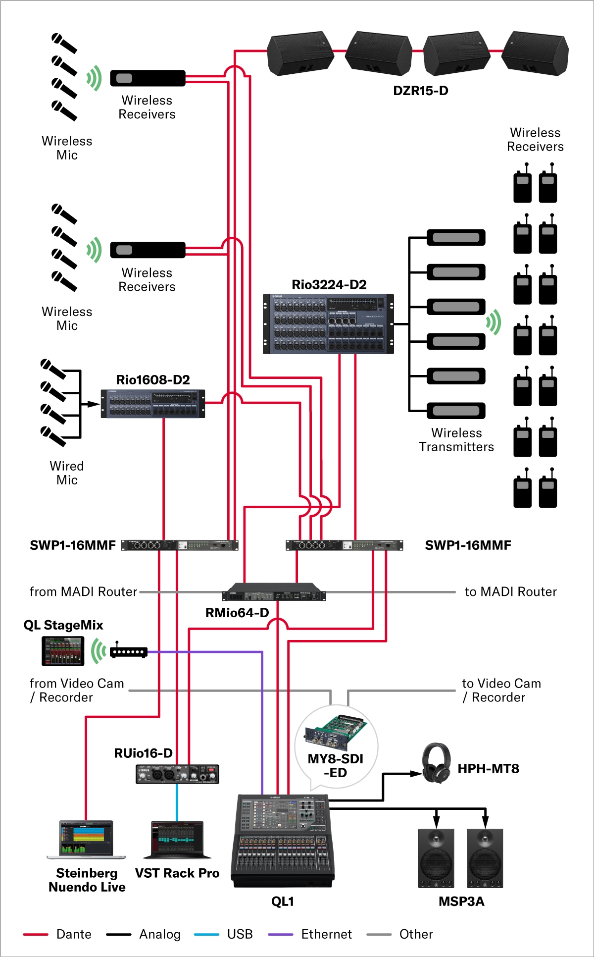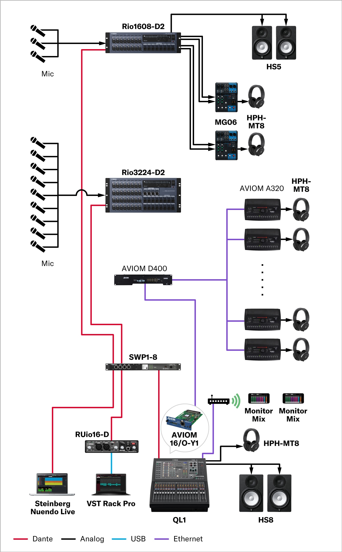 Este é um sistema para gravação de música e voz. Desde configurações com um único microfone até gravações simultâneas de dezenas de canais, o equipamento e software da Yamaha permitem configurar um sistema que se adapta de forma ideal aos seus objetivos, escala e orçamento. Ao utilizar uma rede de áudio como o Dante, a fiação pode ser simplificada de forma significativa sem comprometer a qualidade do som.