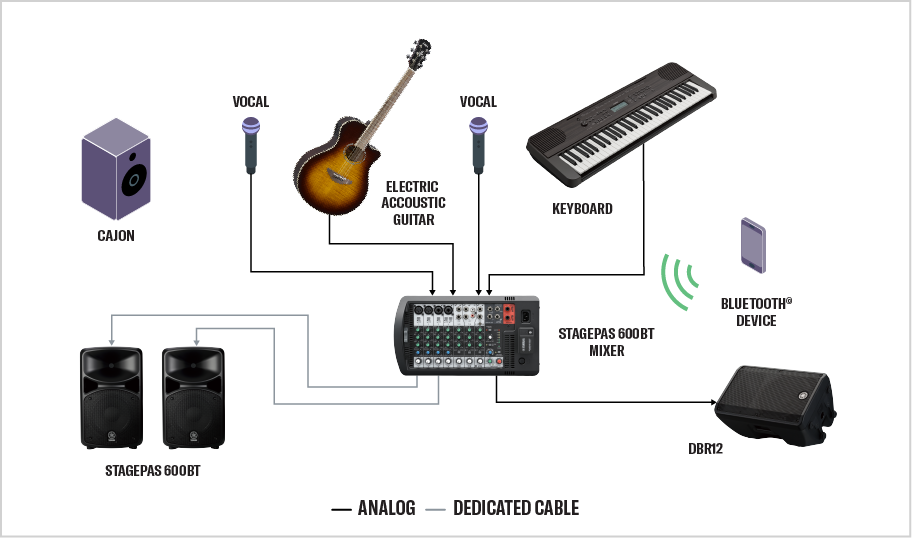 Dispõe de um painel de controlo intuitivo, permitindo uma utilização simples mesmo para quem tem pouca ou nenhuma experiência em reforço sonoro. Neste exemplo, o STAGEPAS 600BT foi combinado com um pequeno subwoofer para acrescentar mais impacto ao evento. Existem versões mais pequenas e maiores do STAGEPAS, adaptadas a diferentes necessidades – não deixe de explorar as outras opções!