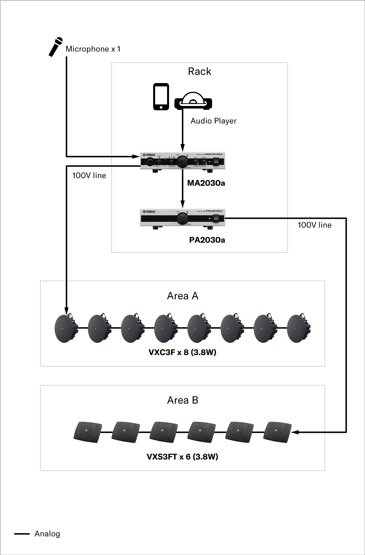 Quando uma área é dividida em duas zonas, pode configurar-se o volume de forma separada para cada zona, desligando a ligação de volume entre o amplificador MA2030a e o amplificador de expansão PA2030a. Isto permite que os clientes ouçam música ambiente no volume ideal, tanto numa sala tranquila como numa área mais ruidosa, como um terraço.