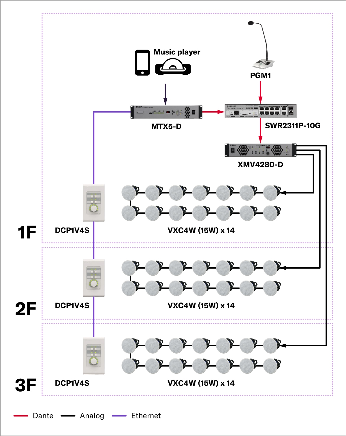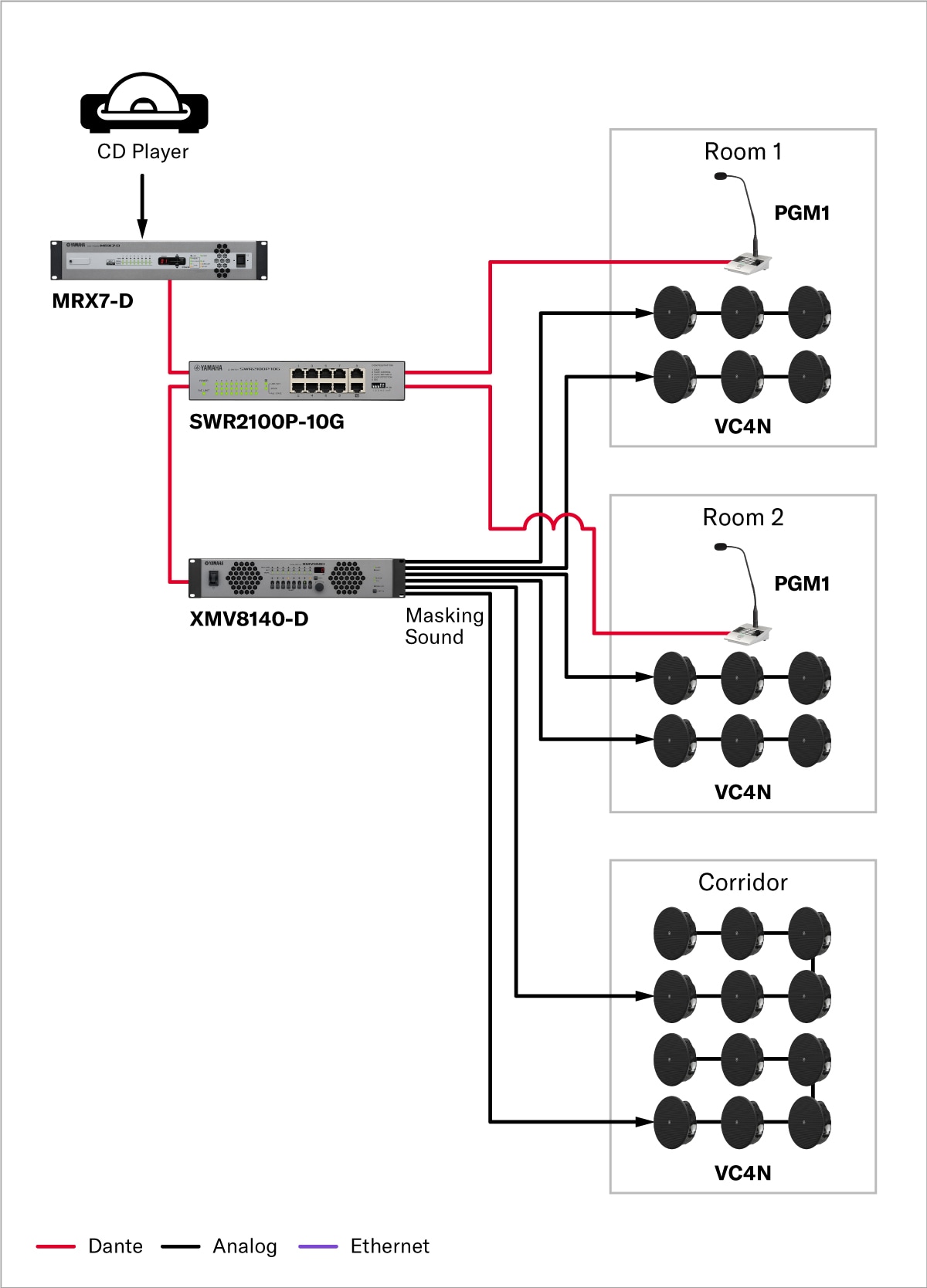 O processador de sinal MRX7-D emite áudio para proteger a privacidade das conversas. A coluna de teto VC4N é utilizada tanto para a reprodução de música ambiente, como para garantir a privacidade das conversas. A VC4N é uma coluna compacta e de baixo perfil, com características sonoras naturais que a tornam ideal para a reprodução de música.