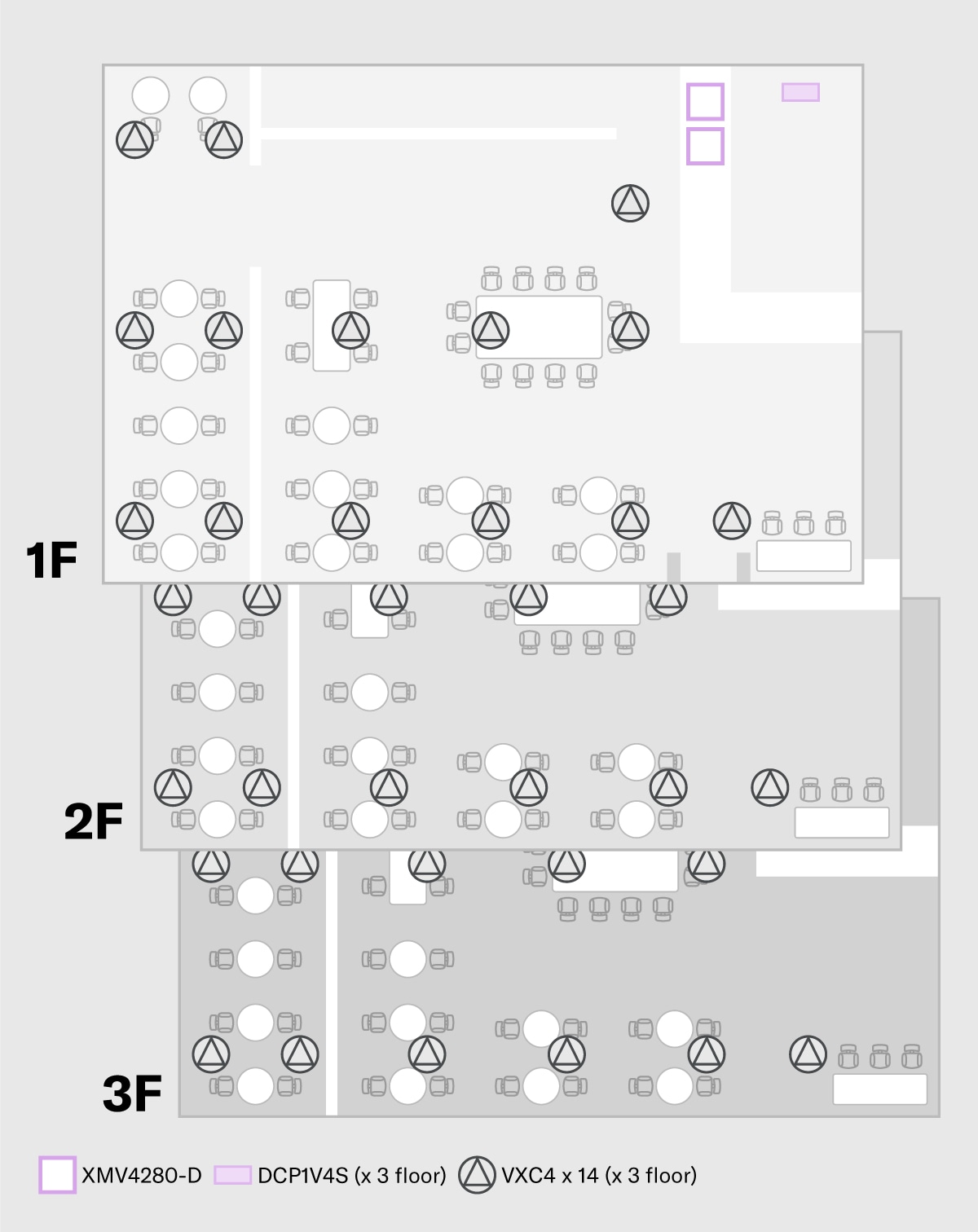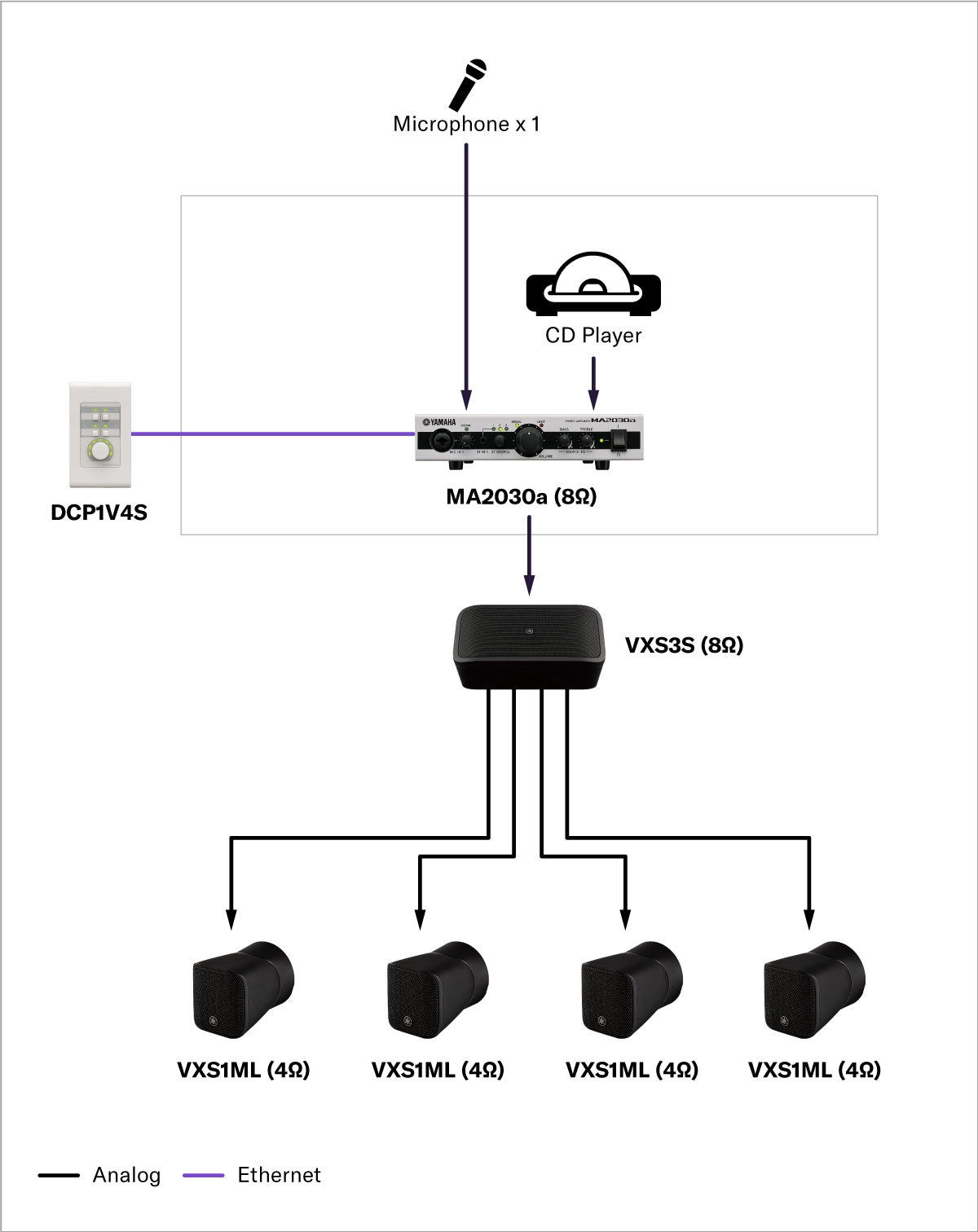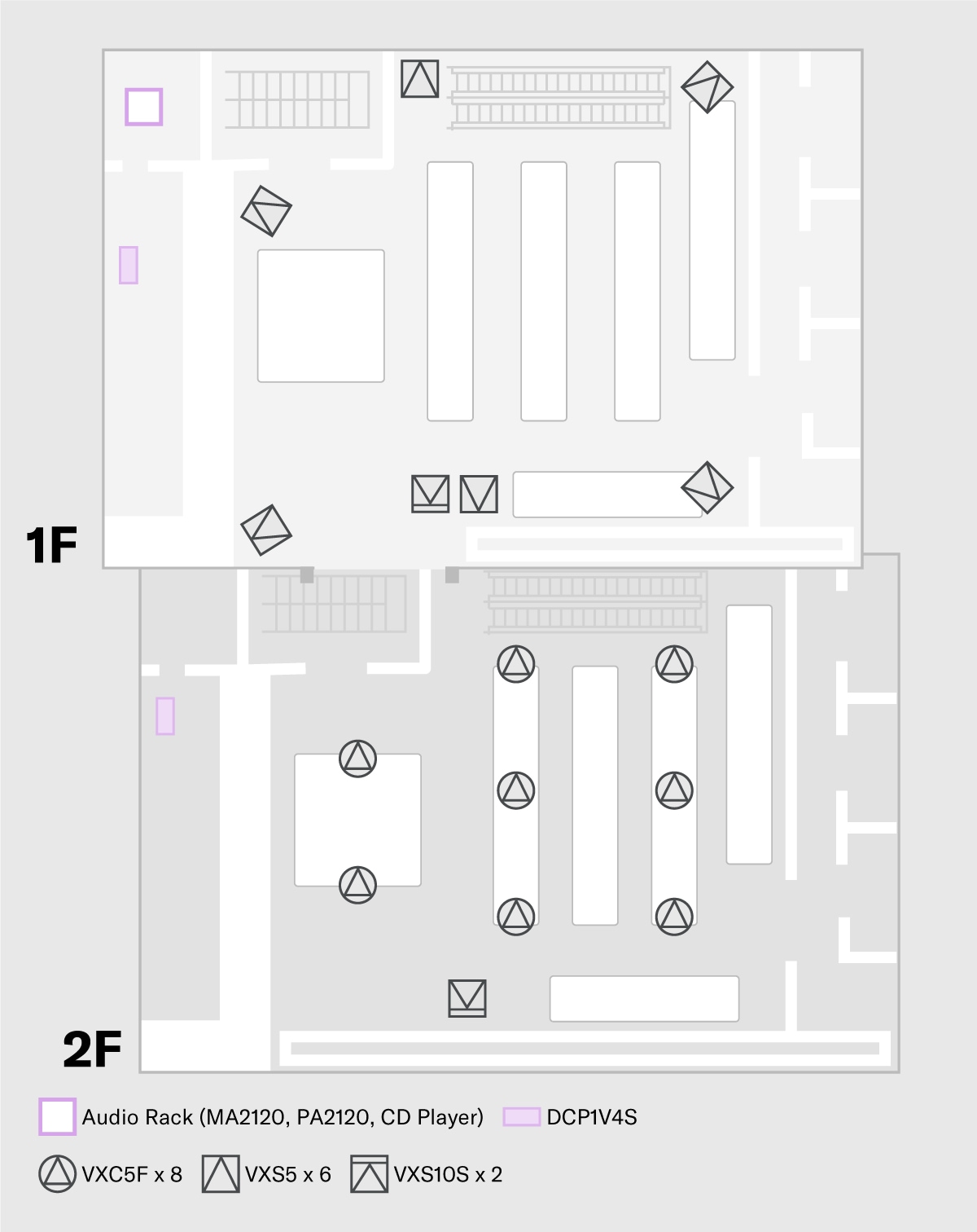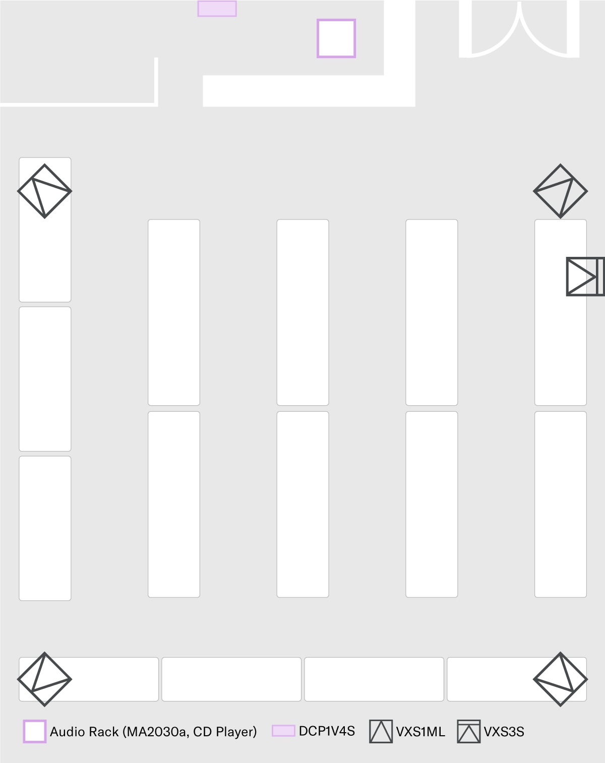 Este sistema conta com uma fonte de reprodução de música ligada a um amplificador compacto PA2030a, com as saídas ligadas às colunas VXS1ML e VXS3S, resultando num sistema de música ambiente de alto desempenho e bem equilibrado, que contribui de forma significativa para a atmosfera geral.