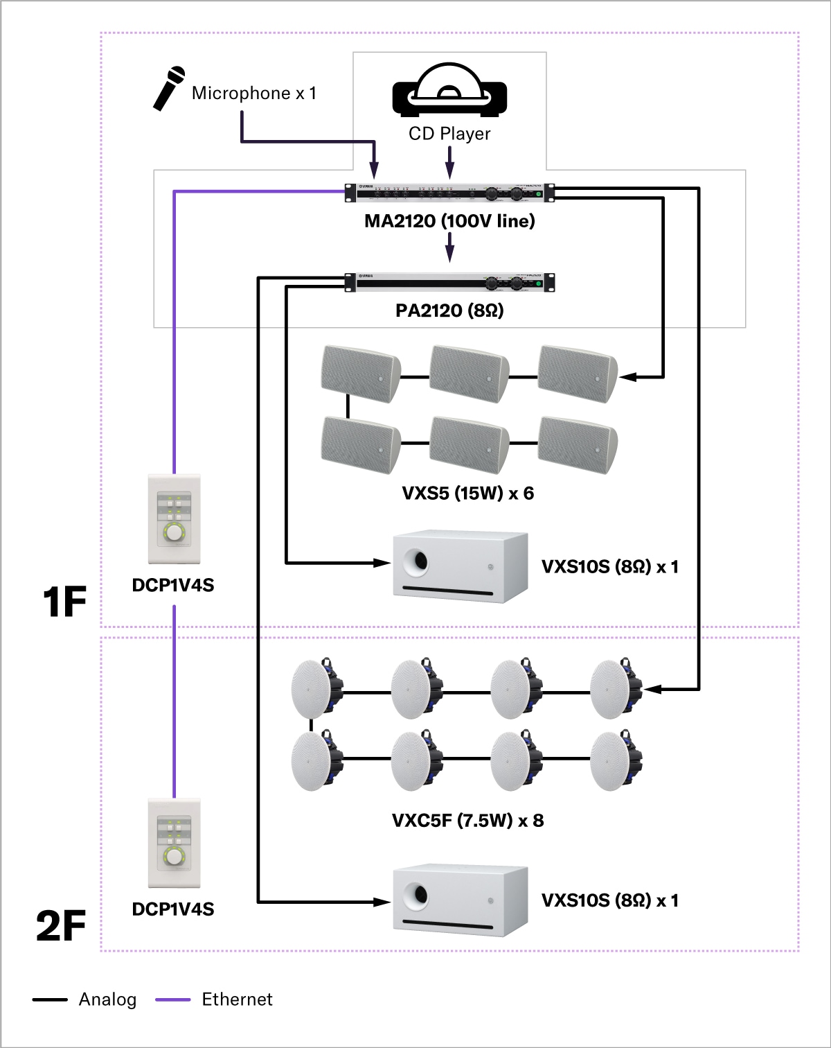 Este sistema é capaz de fornecer música ambiente diferente para diferentes zonas ou andares de um edifício. Além das fontes de música individuais e dos níveis de volume configurados para as áreas do primeiro e segundo andar, a seleção da fonte e o nível de volume podem ser controlados a partir de um controlador convenientemente localizado, para refletir os produtos em exposição, o número de clientes na loja ou acomodar eventos especiais.