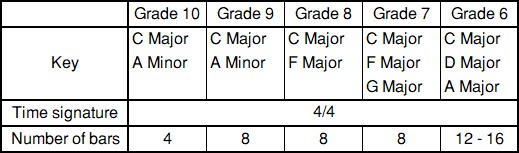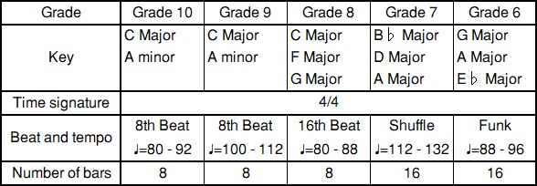 Examiners select one piece and ask candidates to play based on the presented bass pattern and chord progression along with the rhythm track by sight.