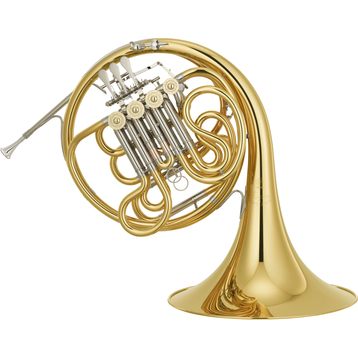 Série Customizada de Trompa de Harmonia Dupla. Afinação: Fá/Si bemol. Cilindros: 4 cilindros de rotor. Tamanho da campânula: médio. Tipo de campânula: desmontável. Diâmetro do tubo: 12,1mm (0.476"). Camisas dos cilindros: níquel prateado. Cilindros de rotor: sólidos. Ação de alavanca: mola.