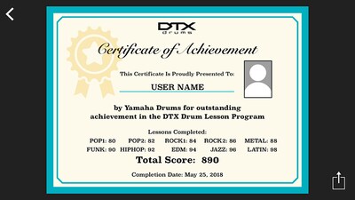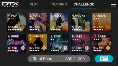“Challenge Mode” é uma nova função da app DTX402 que as tuas habilidades. Basta tocar as músicas de Estudo/Treino sem cometer nenhum erro, para receber um “Drummer’s Certificate” oficial da equipa Yamaha DTX para poder partilhar nas redes sociais.