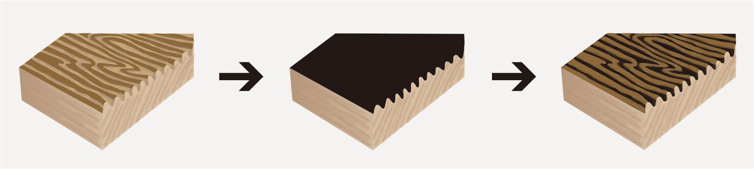 A técnica de acabamento tradicional japonês conhecido como "UZUKURI" foi adaptado para poder ser aplicado em baterias. Neste processo, é aplicado uma lixa nas áreas mais suaves do grão da madeira e em seguida todo o casco é revestido com uma camada muito fina de tinta preta. Antes do revestimento final é aplicado novamente uma lixa, num processo que realça a beleza natural do grão de carvalho (Oak).
