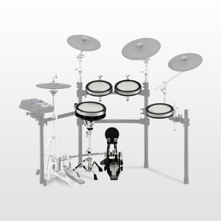 Um conjunto de pads de bateria electrónica prontos para recarregar a sua bateria DTX, o que inclui um pad de tarola com um suporte, 3 pads de timbalão e um pad de bombo.