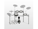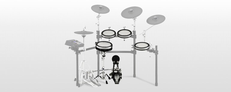 Um conjunto de pads de bateria electrónica prontos para recarregar a sua bateria DTX, o que inclui um pad de tarola com um suporte, 3 pads de timbalão e um pad de bombo.