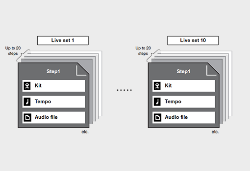 A nova função "Live Set" permite a organização e configuração livre de várias combinações de kits, tempos e arquivos de áudio e faixas de apoio, e a sua recuperação com um único toque. É possível, também, criar várias configurações de clique para acomodar diferentes formas de tocar.
