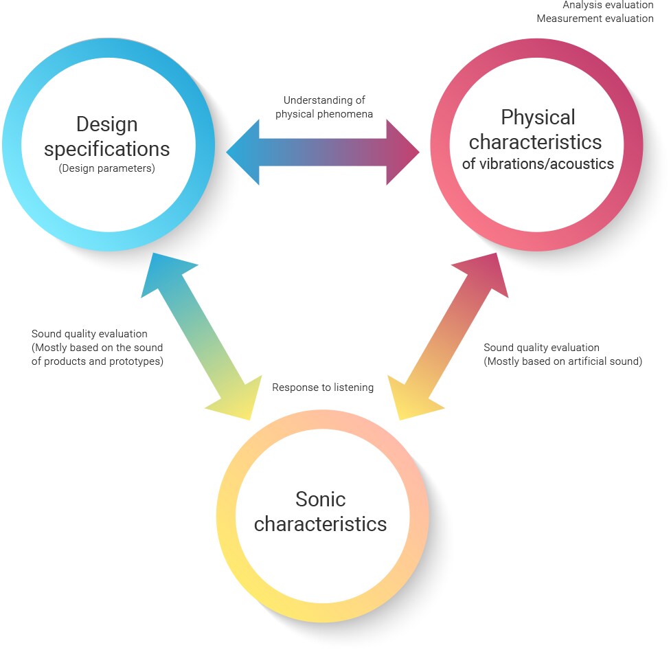 For acoustic product development, we make constant efforts to define and quantify the correlation between design specifications and vibration, and between the physical properties of an object and its sonic characteristics.