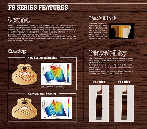 The FG series features a state-of-the-art soundboard bracing design developed to produce a new level of richness from mid to lower registers and add a boost in volume.