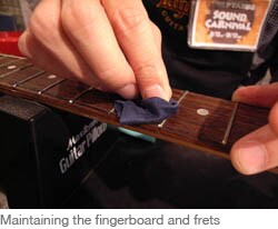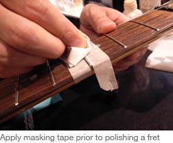 It is not so difficult to repair minor damage. Merely polish the head of the fret with a polishing compound until it is smooth again. When polishing a fret, be sure to first cover all other surrounding areas with masking tape or the like, so that the polishing compound does not damage the fingerboard or any wooden parts. Do not apply excessive pressure when polishing a fret-polish lightly and with care. For major damage that cannot be repaired with polishing compound or very deep damage, be sure to have a specialist take a look.