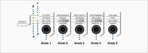 There's an enormous amount of music making power under the hood of the MOTIF-RACK XS and there's no easier way to get at that power than with the five Control Knobs. These convenient knobs let you tweak the sound of the instrument in real time - saving you the hassle of having to wade through several display pages to get to the parameter you want to change. Need to adjust the reverb level for the selected Voice? Press the SELECT button to call up the fourth row of parameters, then turn Knob 2. Want to quickly change the tone of the Voice, such as taking a little bit of the high end off of a piano Voice? Call up the third row and adjust the various EQ bands - using Knob 5 to the highs. Or boost the bass of a Voice with Knob 1. If you want to adjust the volume of the selected Voice, call up the first row and turn Knob 5. Two of the knob settings are even assignable, letting you choose your own favorite parameters for custom control.